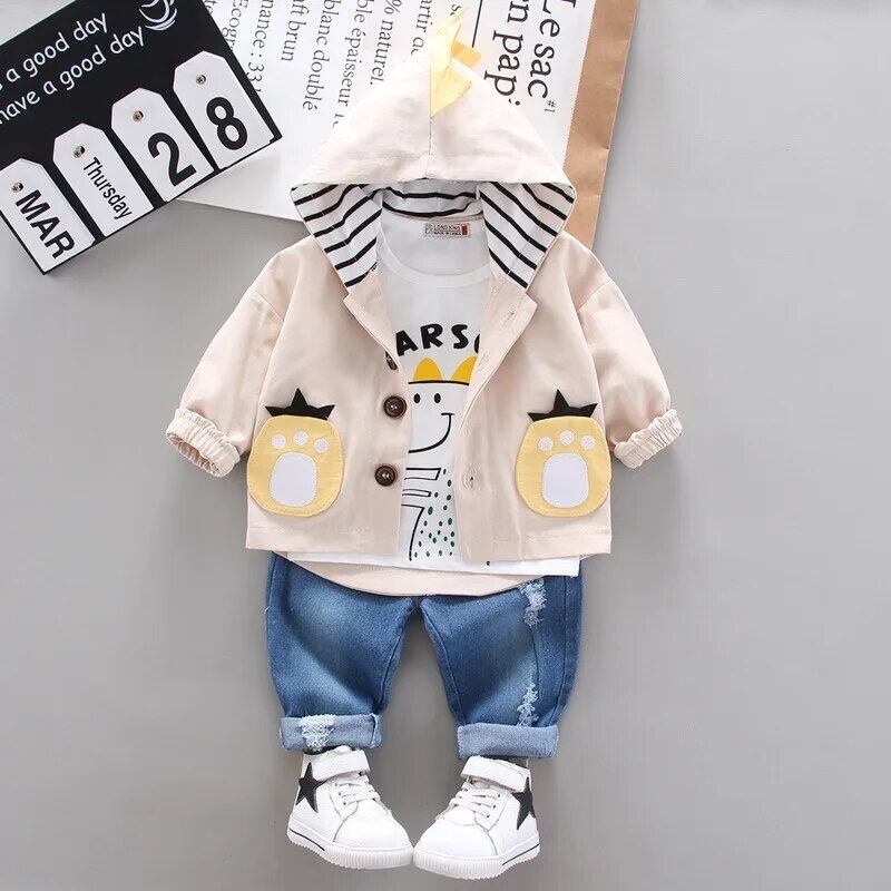 可愛い恐竜柄のトップス、パンツ、フード付き上着のセットで、思わず笑顔がこぼれちゃいます。
