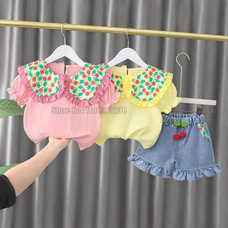 華やかさと可愛らしさが共存するフリル襟のトップスとデニムショートパンツのセット。