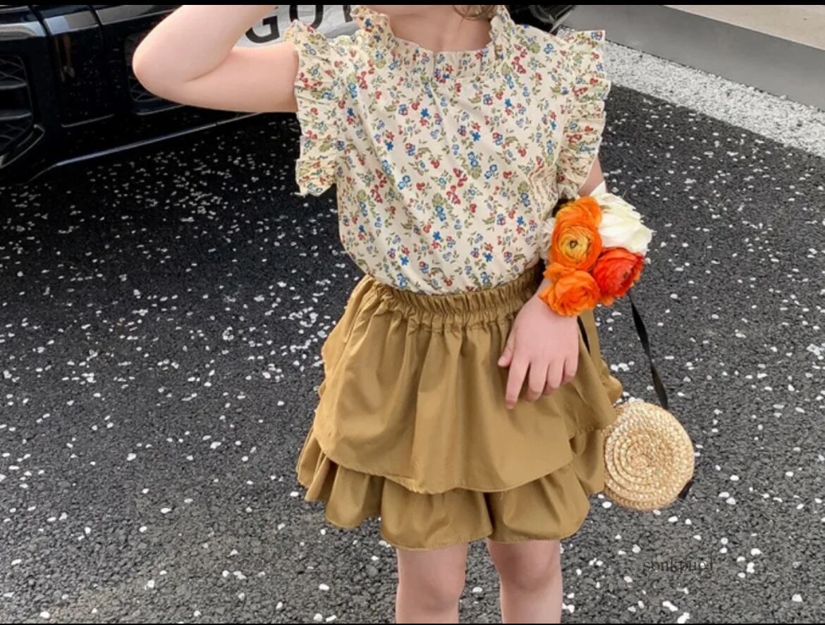 トレンドのフリルトップスとスカート風パンツの組み合わせは、今注目のアイテムです。