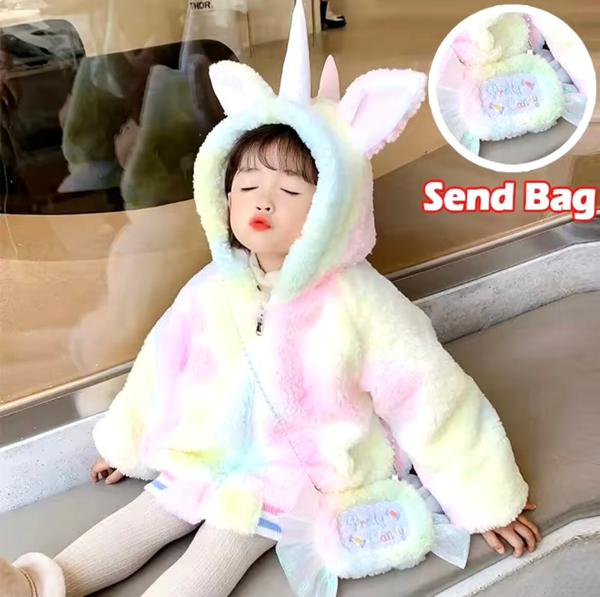 ユニコーンのデザインがキュートな、ふわふわジャケットです。